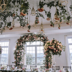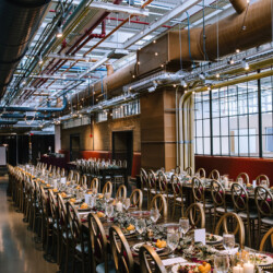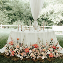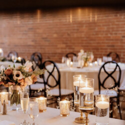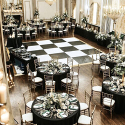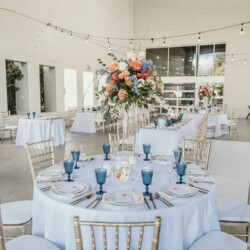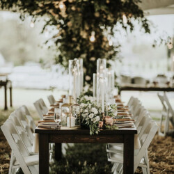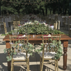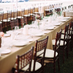 Mahogany Chiavari Chair, Wine Glass, Water Goblet, Pipe and Drape, Uplights, Crystal Chandelier, 60" Round Table, Farm Table