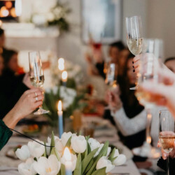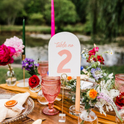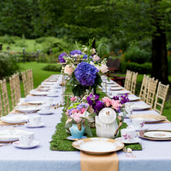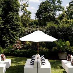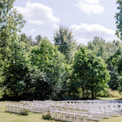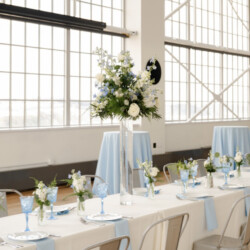 Boxwoods, Water Goblet, Wine Glass, Square Stainless Fork, Square Stainless Knife, Royal White Dinner Plate, White Napkin, White Table Linen, Cross back Chair