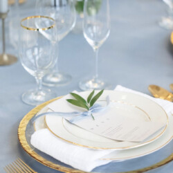 Gold Single Beaded Charger, Royal White Bread and Butter Plate, Silver Fork, Silver Knife, Silver Spoon, Bella Gold Wine Glass, Bella Gold Water Goblet, Bella Gold Champagne Flute