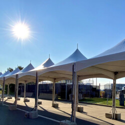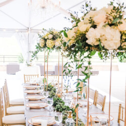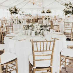 Jumbo Trac Tent, Rectangle Chandelier, Bistro String Lights, Mahogany Chiavari Chair, Pedestal Fan, Kings Table, White Table Linen