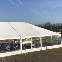 Jumbo Trac Tent, 30'x30' High Peak Tent, Clear Tent Sidewalls, Bistro String Lights, Cocktail Table, Ivory Table Linen